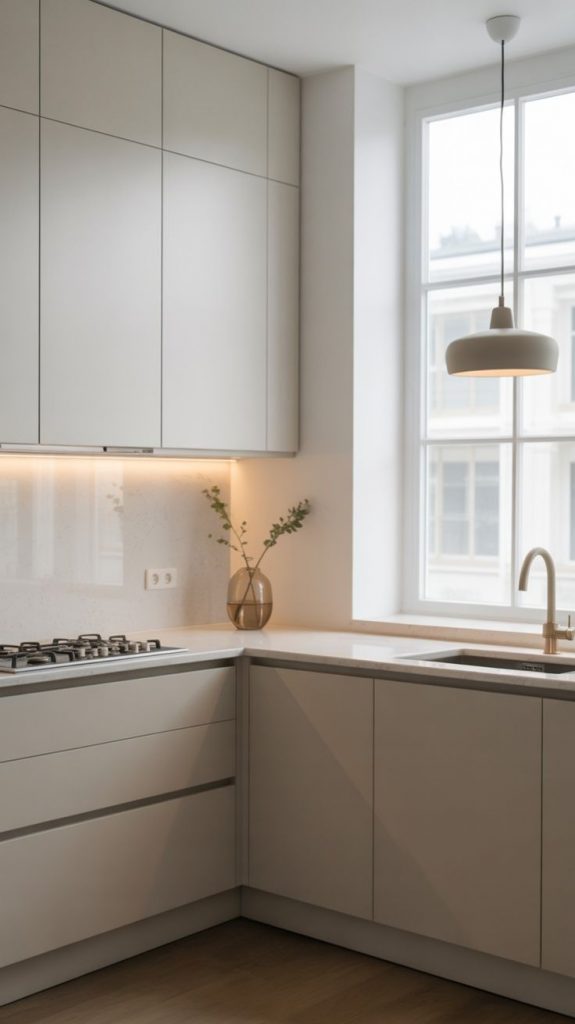 This kitchen showcases the essence of minimalist elegance with its smooth matte cabinetry and clean lines. The warm white palette reflects natural light beautifully, creating a bright yet soothing atmosphere. A single ceramic pendant lamp and a slim glass vase with greenery add soft organic accents. The subtle under-cabinet lighting highlights the marble backsplash, bringing depth and warmth without clutter. It’s a timeless, balanced space that feels calm, functional, and effortlessly refined.