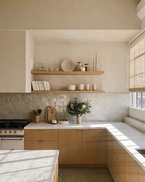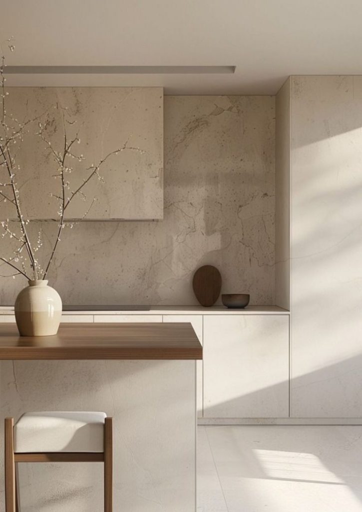 This kitchen celebrates the art of subtle luxury with its soft beige stone textures and clean lines. The seamless cabinetry and natural light create a calm, sculptural atmosphere. A wooden countertop adds a touch of warmth and balance to the cool stone surfaces, while the minimal accessories—like the simple ceramic vase and organic decor—enhance the tranquil mood.