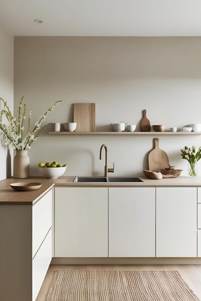 This kitchen showcases the calm elegance of neutral tones and organic textures. Soft beige walls, light wood countertops, and matte white cabinets create a warm, inviting atmosphere without compromising simplicity. The open wooden shelf with carefully arranged ceramics adds a personal yet uncluttered touch. Brass details on the faucet introduce subtle sophistication, blending modern design with natural warmth.