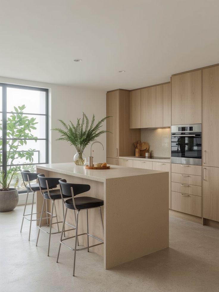 This kitchen embraces a warm, refined minimalism with soft beige tones and natural textures. The sleek cabinetry blends seamlessly with the marble-effect surfaces, while the wooden island base adds an organic contrast. Elegant pendant lights and subtle gold fixtures introduce a hint of sophistication. Flooded with natural light through sheer curtains, the space feels airy, calm, and timeless — a perfect balance of modern design and serene comfort.