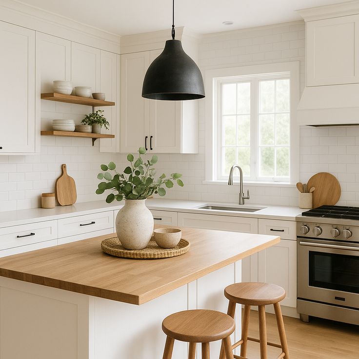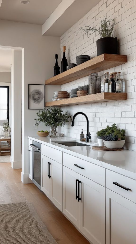 This kitchen design blends clean minimalism with bold contrasts. Crisp white cabinets and glossy countertops create a bright foundation, while matte black handles and faucet introduce a modern edge. The warm wooden open shelves and flooring balance the look, adding depth and coziness. Subtle greenery and simple accessories give the space a lived-in, natural charm.