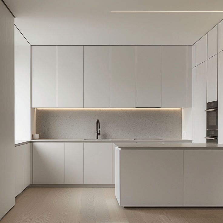 This kitchen embodies a serene and elegant minimalist aesthetic. The clean white cabinetry, handleless drawers, and matte finishes create a seamless look that feels both modern and timeless. The marble backsplash and countertop add a touch of quiet luxury, while the soft under-cabinet lighting enhances depth and warmth.