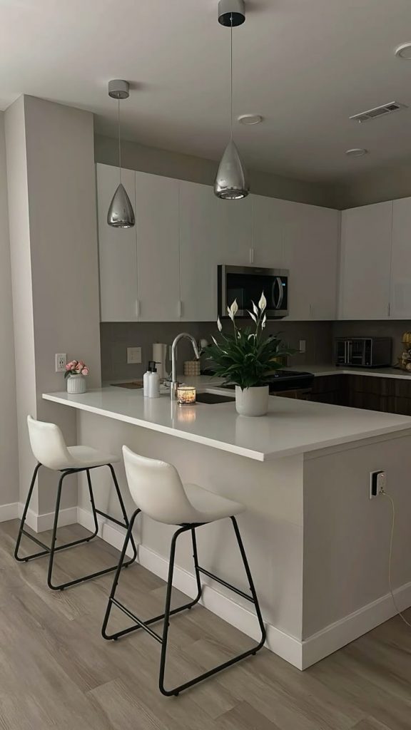 The light wooden stools introduce a natural texture that softens the monochrome palette, reflecting Scandinavian design principles of simplicity and functionality. The subtle greenery and curated accessories keep the space fresh without cluttering it.